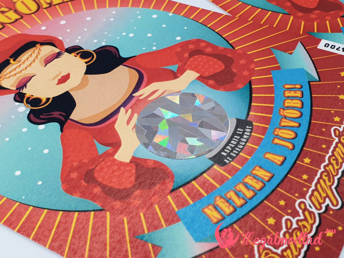 A Szerencsegömb kaparós sorsjegy esküvői meghívó azoknak a pároknak készült, akik szeretik a különleges, kicsit misztikus, mégis játékos megoldásokat. A dizájn központi eleme a jósnő, akinek a kezében egy gömb látható – maga a gömb pedig a kör alakú kaparófelület.
